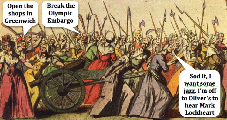 Tonight’s featured artist is Mark Lockheart.The shopkeepers, restauranteurs and jazz lovers of Greenwich defy LOCOG and assert their right to “group improvised music played on sequential harmony in time” (GIMPOSHIT).